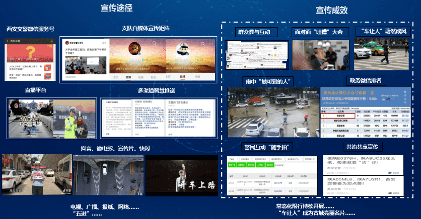 Î÷°²½»¾¯×ÔÓеĺ­¸ÇÁË΢²©¡¢Î¢ÐÅ¡¢APP£¬Ö§¸¶±¦ÔÚÄÚµÄÐû´«Ã½Ì徨Õó£¬Í¨¹ý¶¶Òô¡¢Ö±²¥¡¢Ã½Ì屨µÀµÈÐÎʽȫ·½Î»Ðû´«½»Í¨Õþ²ß¹æÔò£¬ÏȺóÓëÉÂÎ÷µçÊǪ́¡¢ÉÂÎ÷½»Í¨¹ã²¥µÈ¶à¼ÒýÌåºÏ×÷£¬Ö¸µ¼ÊÐÃñʹÓÃ΢ÐÅÉϱ¨¡¢Ò»¼ü±¨¶ÂµÈÇþµÀ¼ÓÈëµ½Î÷°²µÄ½»Í¨¹ÜÀíÊÂÇéÖÐÀ´£¬¶Ô½»Í¨Î¥·¨¡¢²»ÎÄÃ÷ÐÐΪ¾ÙÐÐÆØ¹â£¬¶Ô½»Í¨ÕýÄÜÁ¿¾ÙÐÐÕÅÑï¡£ÏÖÔÚ£¬Î¢ÐÅËæÊÖÅÄÖÜÉϱ¨´ï4000¶àÀý£¬×ÜÁ¿¿¿½ü40Íò£¬ÔÚÈ«Éç»áÐγɹ²Öι²½¨µÄÓÅÒì½»Í¨Æø·Õ¡£±ðµÄ£¬Î÷°²½»¾¯Ò²Ê¹ÓÃ×ÔýÌ壬ʵʱÐû²¼ãåÈÕ¡¢±°ÁÓÌìÆøµÄ½»Í¨Ô¤Åб¨¸æ£¬Ö¸µ¼ÊÐÃñ³öÐС£