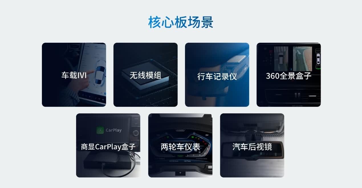 AC8257车联网模组应用场景普遍,可使用于车载IVI、无线模组、行车纪录仪、360全景盒子、商显CarPlay盒子、两轮车仪表和汽车后视镜等场景,助力汽车实现车机互联和车网互联 。