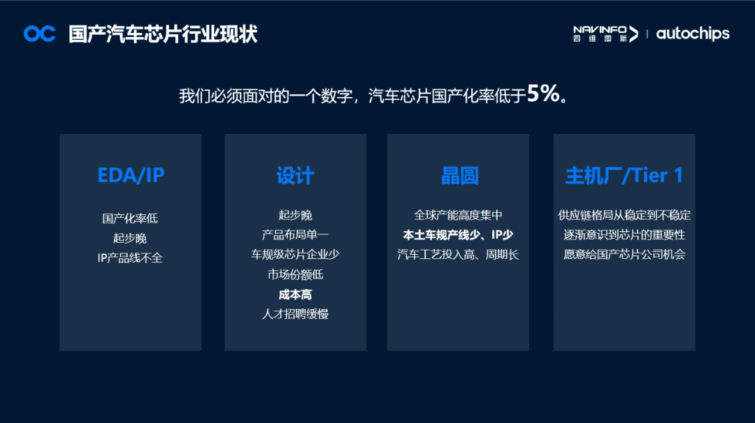 ±¨¸æÌáµ½Ò»¸öÑÏËàµÄÊý×Ö£ºÖйúÆû³µÐ¾Æ¬¹ú²ú»¯ÂÊȱ·¦5% £¬´ÓÉÏÓεÄEDA/IP·þÎñÉÌ¡¢Éè¼Æ³§ÉÌ £¬µ½¾§Ô²ÖÆÔì £¬ÔÙµ½ÏÂÓεÄÖ÷»ú³§ºÍTIER 1Ó¦Óà £¬Ã¿¸ö»·½Ú¶¼±£´æ×ÅһЩÎÊÌâ¡£ÎÒÃDZØÐèÉî¿ÌÊìϤµ½×ÔÉíµÄÎÊÌâ £¬²Å»ªÕÒ³ö¶ÔÓ¦µÄ¾öÒé¡£
