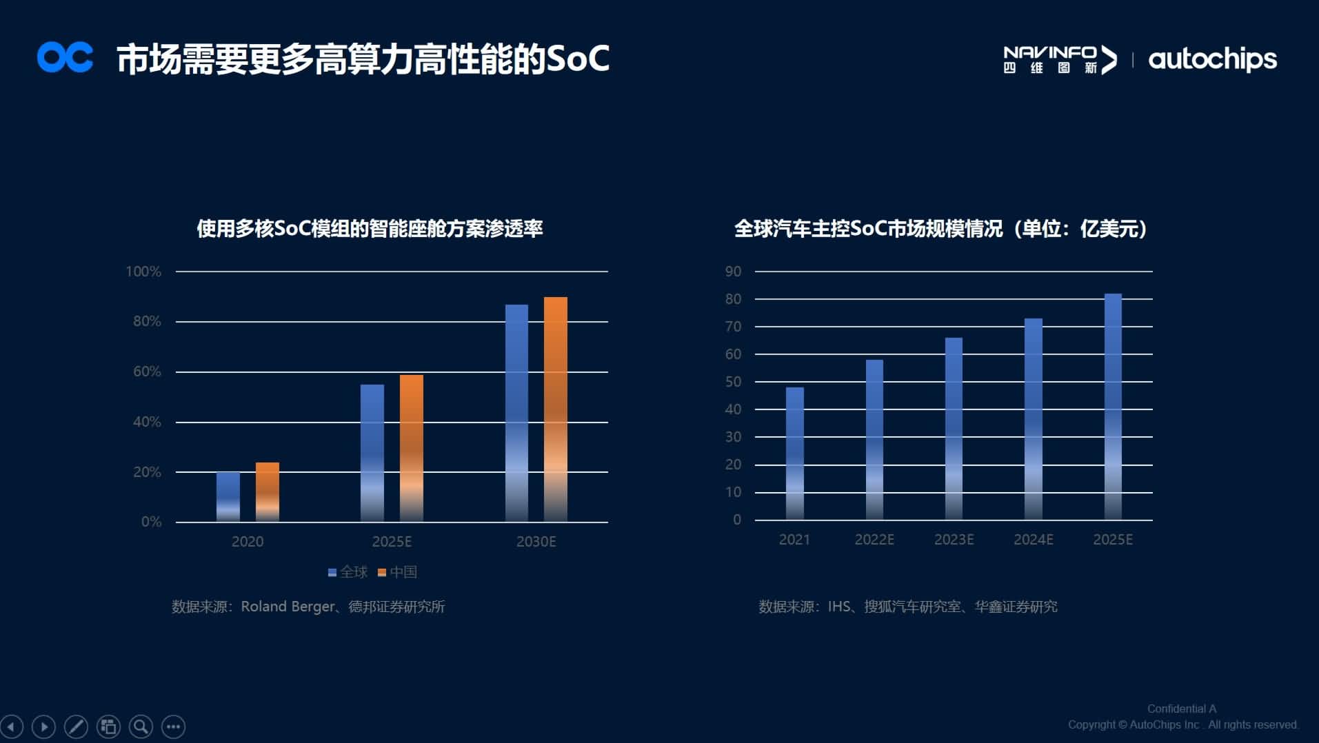 在演讲中,马伟华从汽车电动化智能化浪潮引领车规SoC和MCU厘革谈起,汽车EE架构厘革将导致市场需要更多高算力高性能的自动驾驶SoC和智能座舱SoC 。据IHS Markit预计,2024年座舱NPU算力需求将是2021年的10倍,CPU算力需求是2021年的3.5倍 。全球使用多核SoC模组的智能座舱计划渗透率将在2025年靠近60%,2030年凌驾80%,全球汽车主控SoC市场规模也将在2025年突破80亿美元 。由此配景下带给国产汽车芯片厂商在SoC这条蹊径上将有更长的路要走,更多的事情要做 。