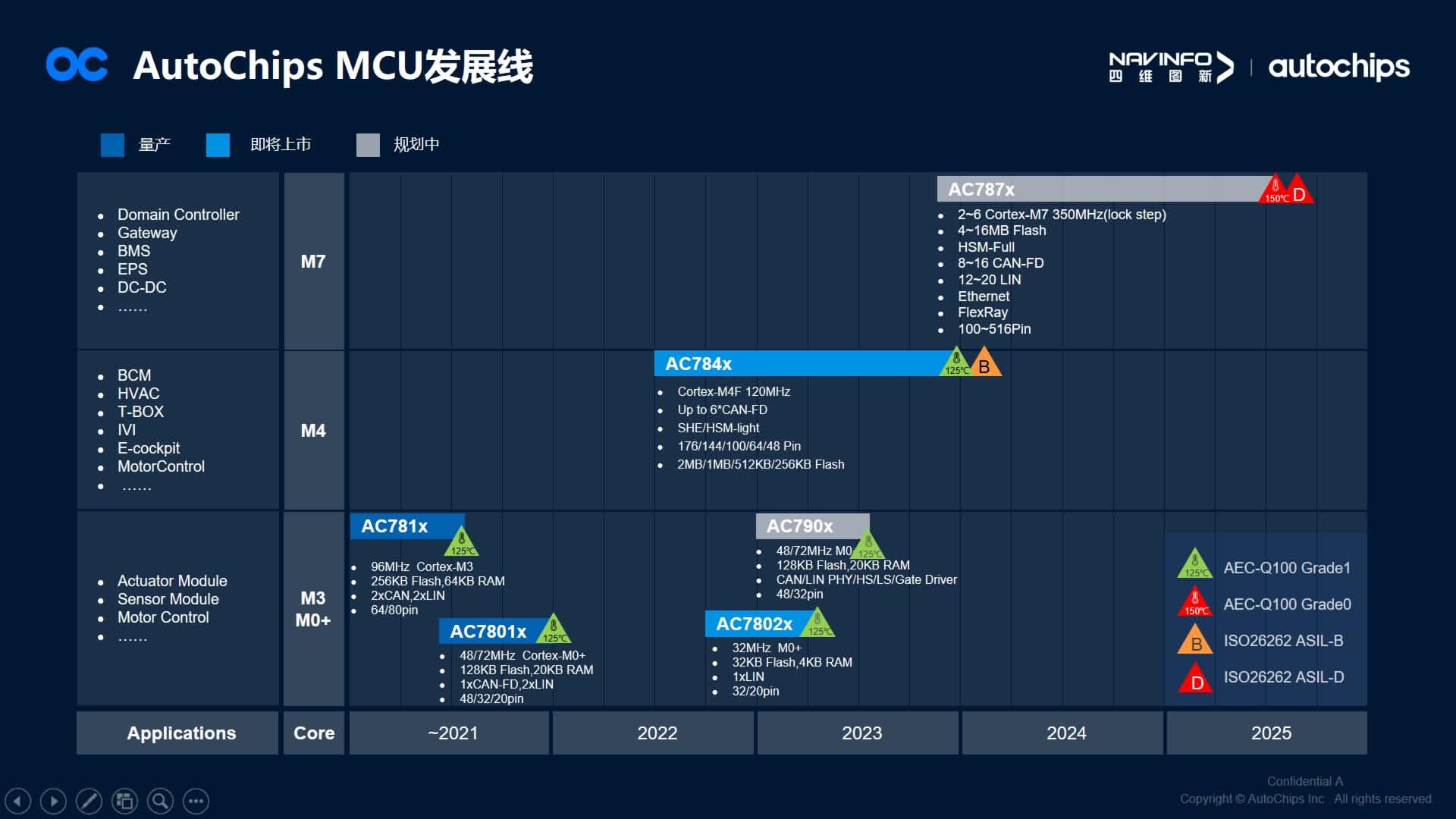 马伟华还在现场分享了AutoChips首颗知足功效清静要求的MCU AC7840x,AC7840x系列是AutoChips首款基于ARM Cortex-M4F 内核的车规级MCU,切合ISO 26262功效清静ASIL-B,支持AUTOSAR 4.4,提供MCAL及设置工具,并且拥有更大的Flash与更多的引脚 。AC7840x的应用将越发普遍,尤其突破了对清静性、可靠性要求更高的底盘域和动力域应用 。现在,AC7840x已经陆续送样,其中有客户已进入产品验证阶段 。