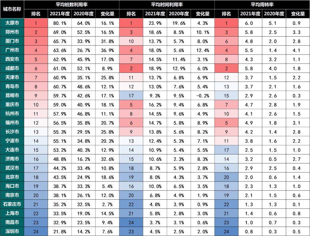 24×ù¶¼»á¹«ÓÃ×®µÄƽ¾ù×®ÊýʹÓÃÂÊ¡¢Æ½¾ùʱ¼äʹÓÃÂÊ¡¢Æ½¾ùÖÜתÂÊÔÚ¾ø¶ÔÖµÉÏ»®·ÖÌá¸ß16.9%¡¢5.2%ºÍ1.6 £¬Ïà¶ÔÔöÌíÂÊ»®·Ö¸ß´ï47.5%¡¢75%ºÍ84% ¡£ÏÃÃÅ¡¢¹ãÖÝ¡¢¸£ÖÝ¡¢³¤É³¡¢¼ÃÄϵȶ¼»áµÄ¹«ÓÃ׮ЧÄÜÌáÉý·ù¶È½Ï´ó £¬º£¿Ú¡¢Ê¯¼Òׯ¡¢Äϲý¡¢ÉîÛڵȶ¼»áµÄ¹«ÓÃ׮ЧÄÜÌáÉý·ù¶È½ÏС ¡£